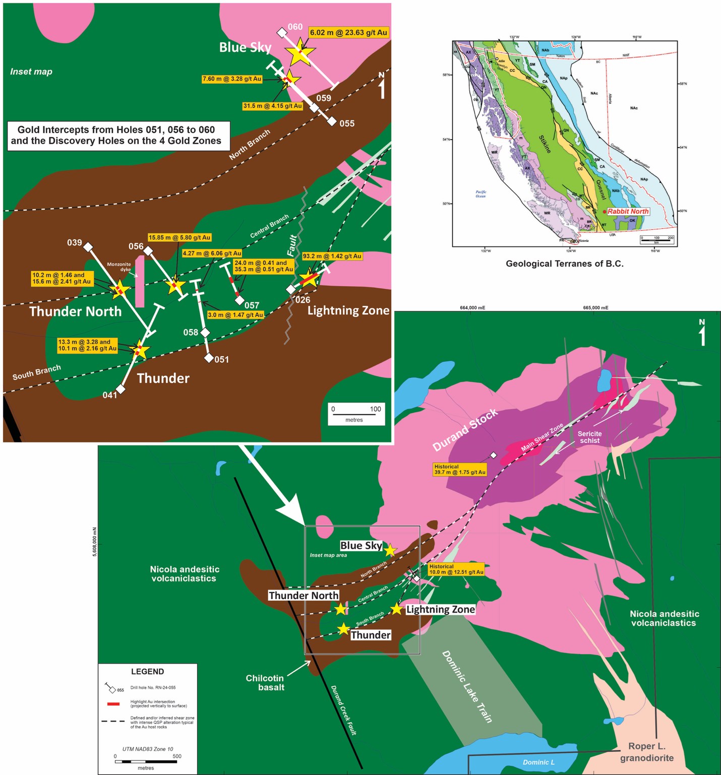 Vancouver, British Columbia--(Newsfile Corp. - July 10, 2025) - Tower Resources Ltd. (TSXV: TWR) ("Tower" or the "Company") is pleased to report the gold assays from the first two of four holes, Nos. RN-25-059 and 060, drilled in May on the Company's Rabbit North property in the heart of the Kamloops mining district (see Fig. 1). Hole 060, a 70 m step-out northeast into the Durand Diorite Stock (Fig. 2) from the diorite-hosted Blue Sky gold discovery in Hole RN-24-055 on the western edge of the stock (31.5 m of 4.15 g/t Au; see December 23, 2024 news release), intersected an exceptional 23.63 g/t Au over 6.02 metres. Hole 059, drilled above Hole 055, cut 7.6 m of 3.28 g/t Au and ended in mineralization grading 4.85 g/t Au.