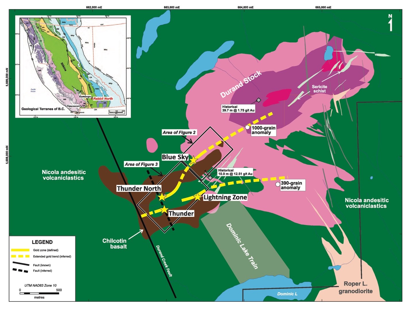 The graben faults are only the latest manifestation of a long-lived structure similar to the Red Line of B.C.'s Golden Triangle and the Porcupine-Destor and Cadillac-Larder Lake Faults of the Abitibi Greenstone Belt. Approximately 147 million years ago the same structural corridor was the focus of the shear deformation, fluid flow and QFP dyke emplacement that produced the orogenic Au-pyrite mineralization. Also, prior to accretion of the Durand stratovolcano to the Cordillera, the fault may also have plumbed the diorite magma and associated porphyry Cu-Au mineralization of the ~215 Ma Durand Stock.