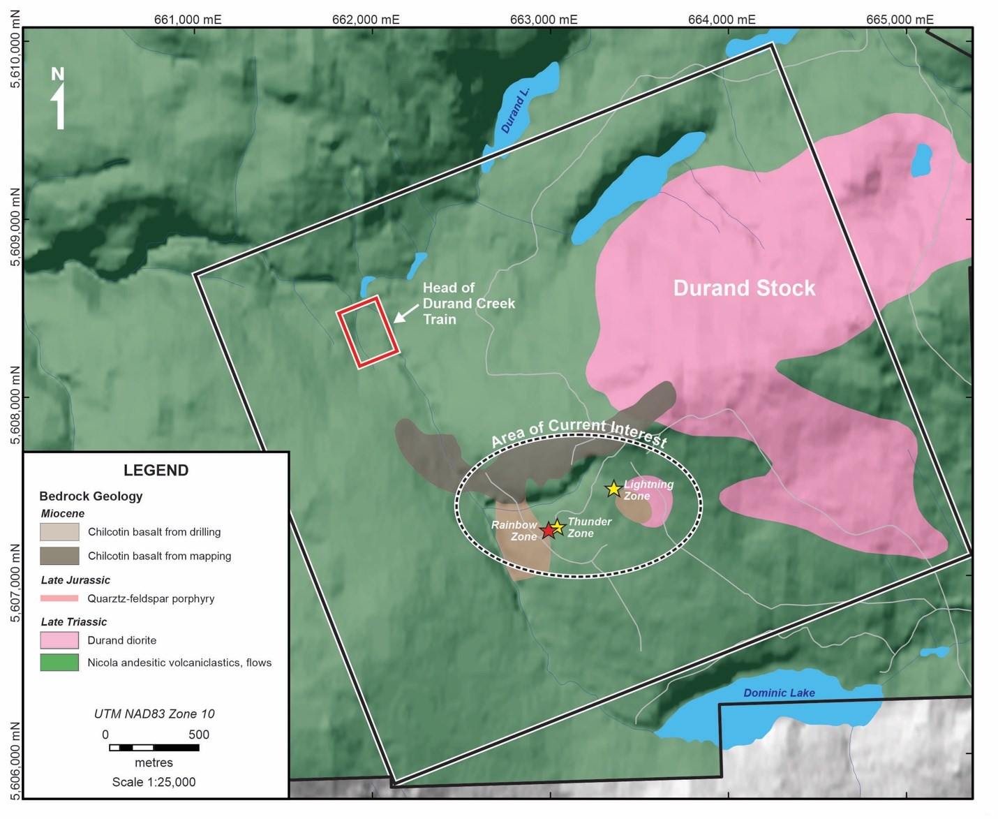 The new survey, totaling ~112 line-km, will comprise 32 east-northeast trending lines 100 m apart and ~3.5 km long, extending from the volcaniclastic terrain west of Durand Creek to the mid-point of the Durand Stock east of the creek (see Fig.2).