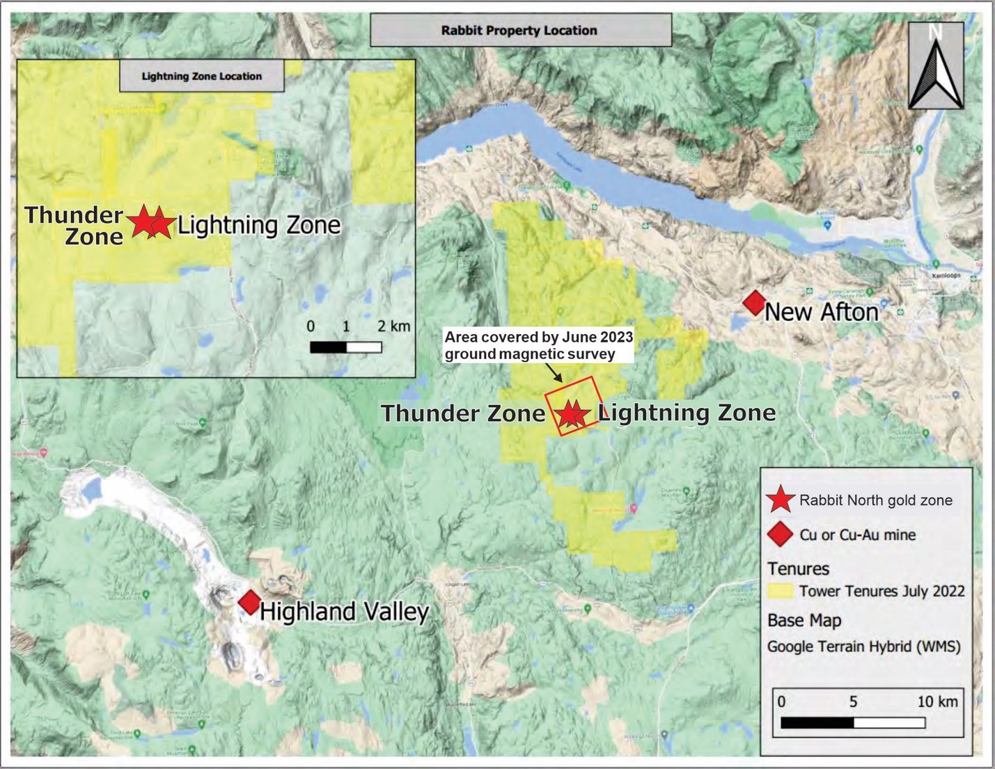 Vancouver, British Columbia--(Newsfile Corp. - June 22, 2023) - Tower Resources Ltd. (TSXV: TWR) ("Tower" or the "Company") is pleased to report that its recent ground magnetic survey has revealed key magnetic trends at each of its Rainbow Porphyry Cu-Au-Mo and Thunder and Lightning Au discoveries on the Company's Rabbit North property near Kamloops, British Columbia, between New Gold's New Afton underground Cu-Au mine and Teck's Highland Valley open pit Cu-Mo mine (see Fig. 1).