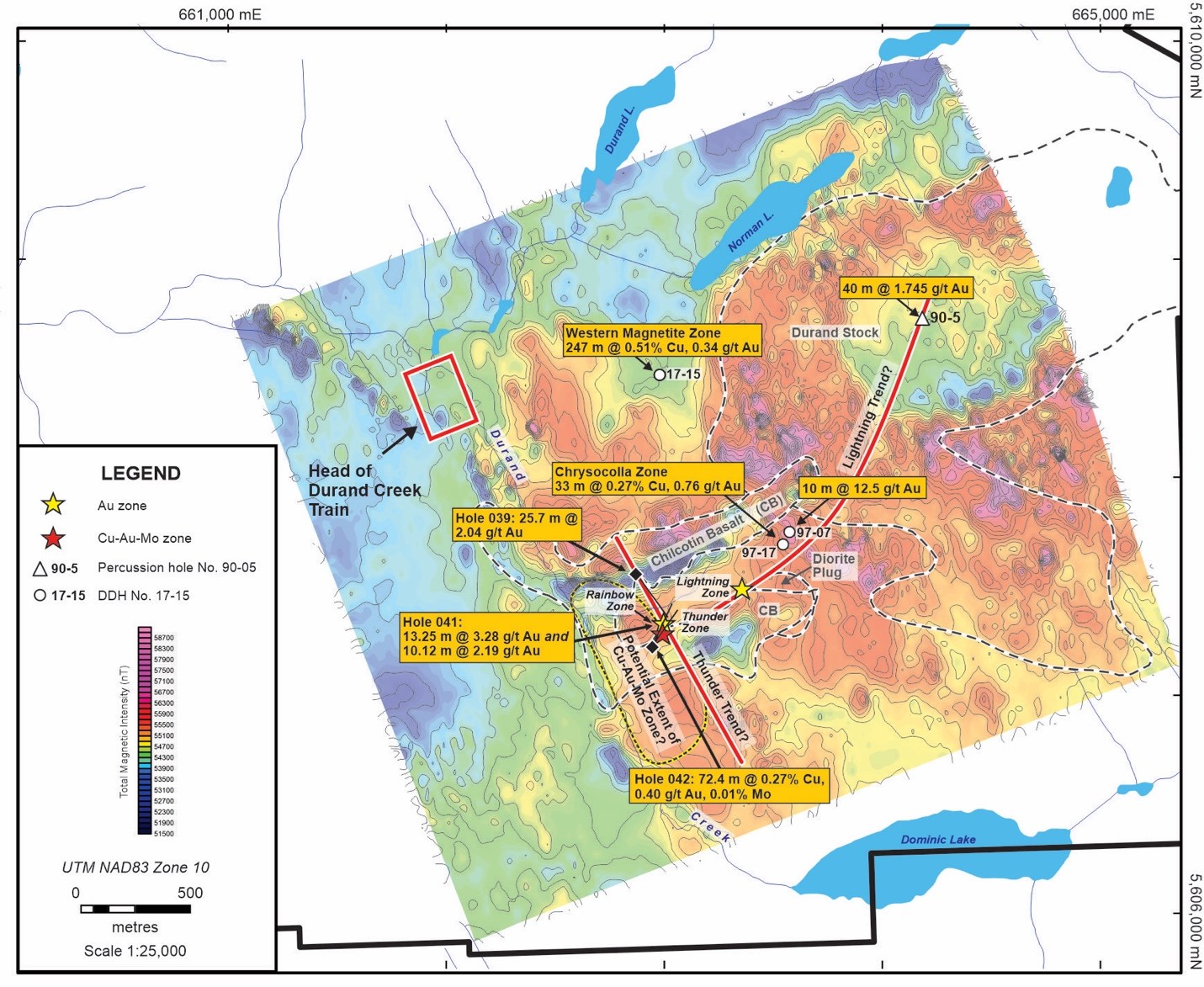 While drilling to date indicates that the Lightning Zone has a limited northeasterly strike length of ~150 m, the gold zone lies astride a prominent disruptive magnetic lineament of the same strike that is at least 3 km long and cuts completely across the Durand Stock (see Fig. 2). Two significant Au intersections were obtained from historical drill holes along this apparent structural lineament northeast of the Lightning Zone - 10 m of 12.5 g/t Au in Hole 97-07 and 40 m of 1.745 g/t Au in Hole 90-5. These are the only historical intersections of mineralization of the shear-hosted Au type (i.e. with no associated porphyry indicative Cu) on the property.