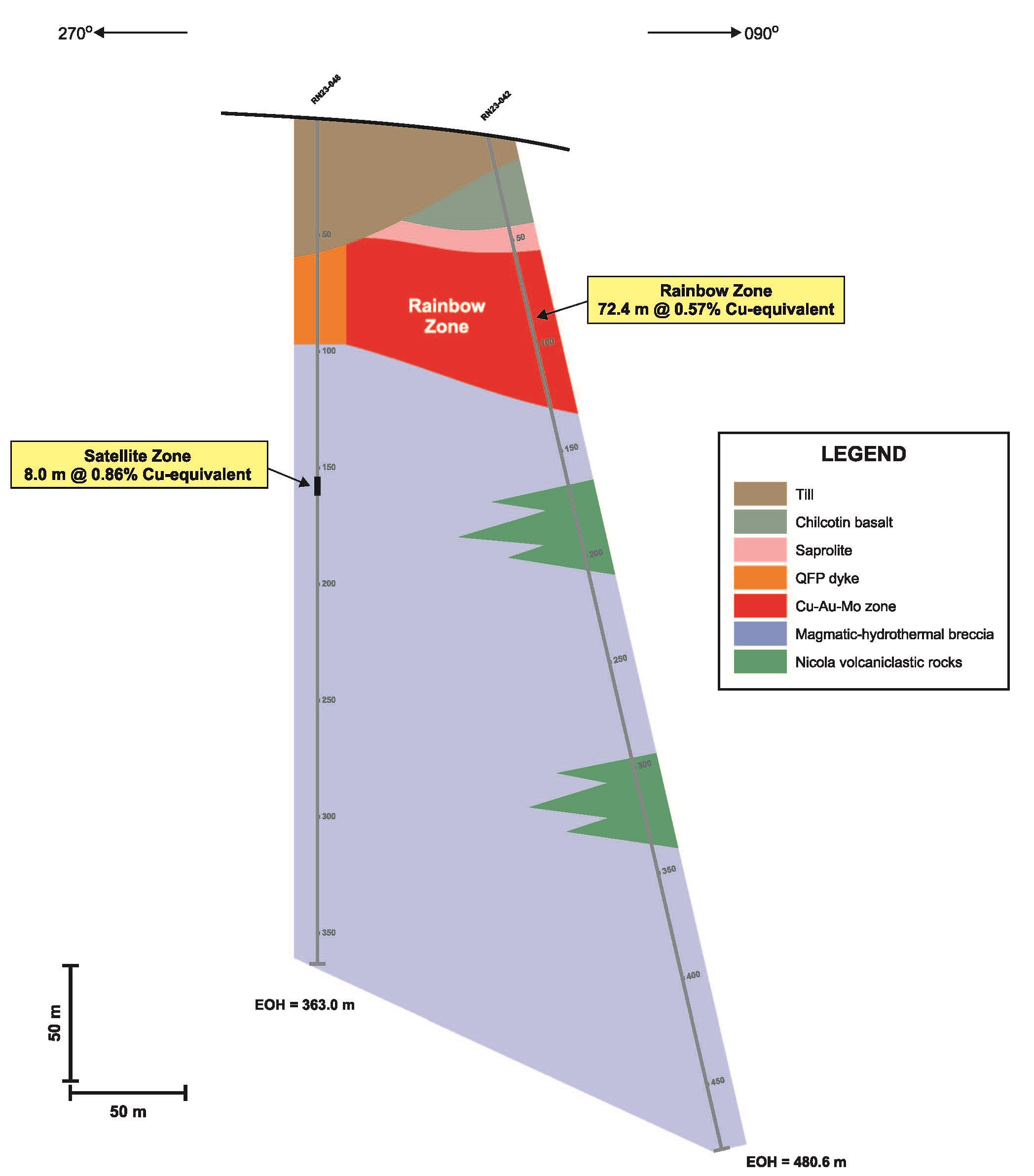 The February 2023 Rainbow Zone discovery holes, Nos. 041 and 042, intersected the eastern edge of the zone which, based on its magnetic response (see Fig. 2), appears to extend 350 m westward to the Durand Creek Fault (see press release of November 14, 2023). These holes were drilled from the same pad with the steeper hole, No. 042 at -65°, intersecting 72.4 m at an average 0.57% Cu-equivalent grade (0.27% Cu, 0.40 g/t Au, 0.01% Mo).