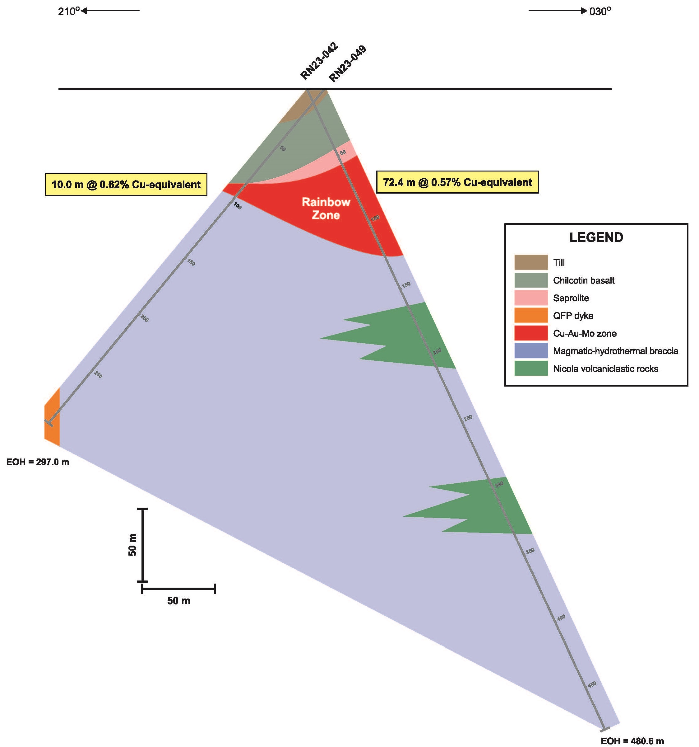 Hole 048 was drilled vertically 50 m west of Hole 042 on the northern edge of the paleo-channel. It did not encounter any basalt, instead intersecting an exceptional 57-m-thick glacial till section followed by a 40 m dyke of post-Rainbow quartz-feldspar porphyry (QFP) to 96.8 m before reaching the targeted magmatic-hydrothermal breccias. Together the till and QFP occupy the same interval as the Rainbow Zone occupies in Hole 042 (see Fig. 3), precluding intersection of the zone. The underlying breccias is, however, weakly mineralized like the corresponding breccias interval directly below the Rainbow Zone in Hole 042. A slightly deeper, high-grade, 8.0 m satellite interval between 154.0 and 162.0 m averaged 0.86% Cu-equivalent (0.45% Cu, 0.59 g/t Au, 0.009% Mo; see Fig. 3 and Table 1), significantly higher than the average 0.57% Cu-equivalent grade of the Rainbow Zone in Hole 042.