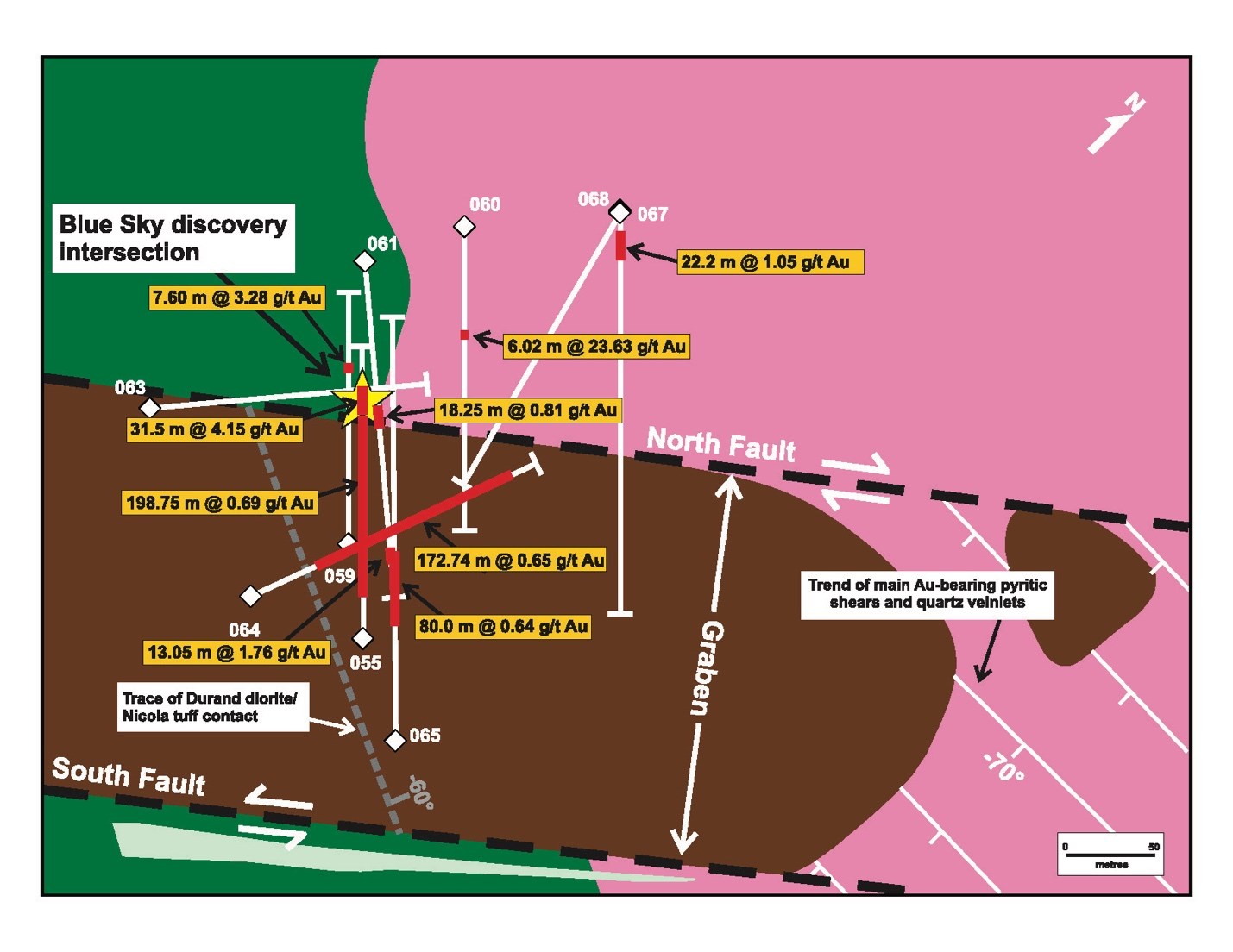 The first two holes, Nos. 063 and 064, were drilled through the cover basalt in a northeasterly direction and hence were orthogonal to the NW trending contact of the Durand Stock, subparallel to the main ENE shear trend and perpendicular to Tower's previous four previous Blue Sky drill holes, Nos. 055 and 059 to 061. Despite being parallel and collared only 150 m apart, the two holes encountered completely different rocks beneath the basalt, with Hole 063 intersecting only Nicola tuffs and Hole 064 intersecting only Durand diorite, indicating that the contact of the stock has been offset ~100 m to the southwest between these drill holes. Hole 063 entered the fault zone directly below the cover rocks and remained in it for over 100 m, indicating that the fault is vertical.