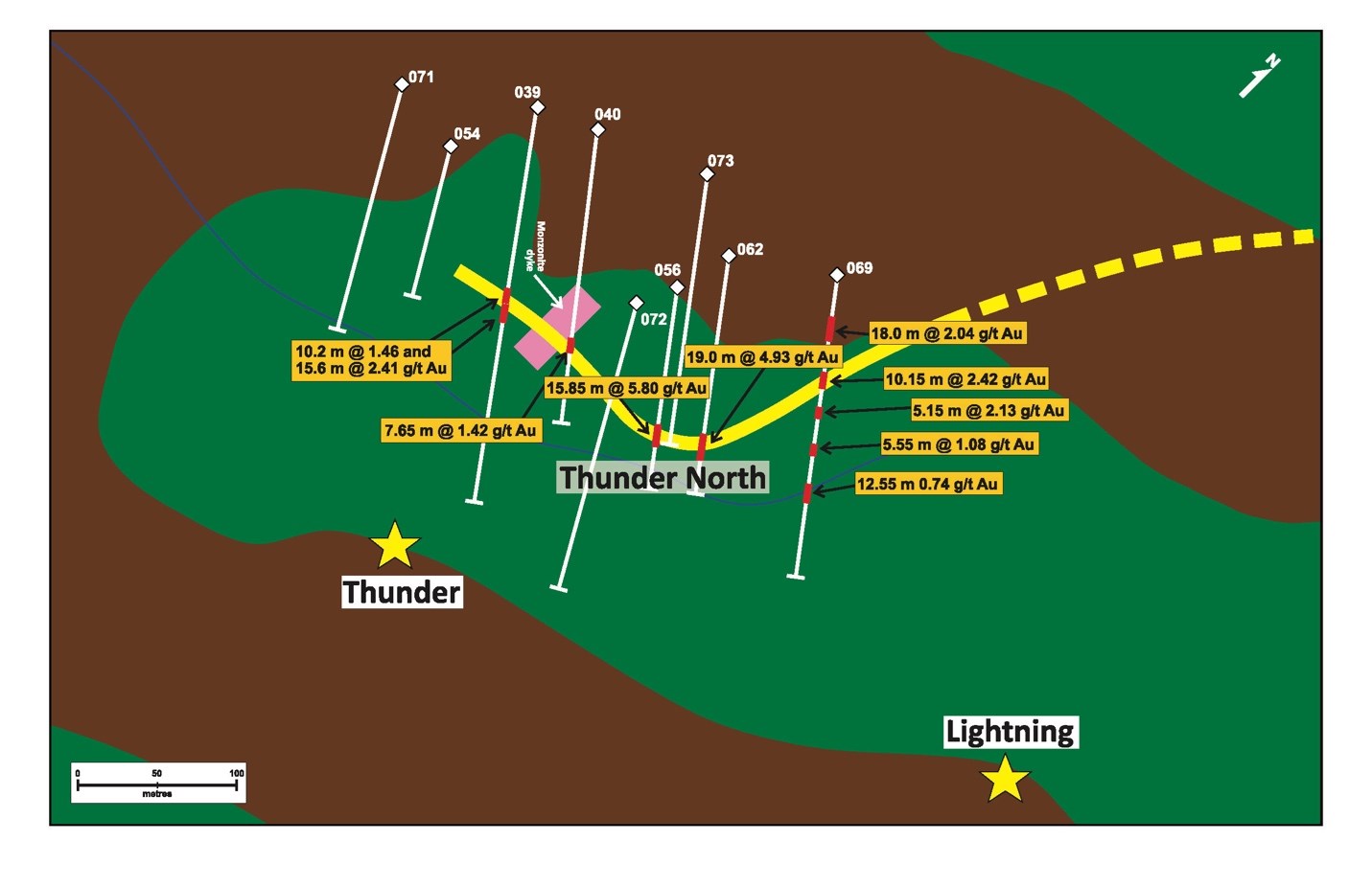 Figure 3 - Significant gold intersections in Hole 069 relative to previous intersections of the Thunder North zone. See Figure 1 for legend.